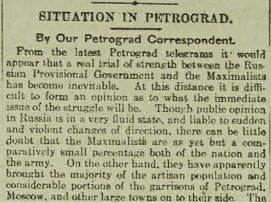 On November 8, it wasn't even clear to the London press what the outcome of the "Extremist Rising" was going to be. Though Lenin had already declared the provisional government "deposed," the English press wasn't convinced yet. They may not have even been aware of his brash declaration.