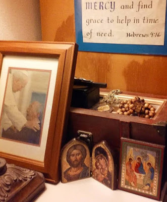 Right to left, a small Russian icon of the Trinity, icons of Jesus and Mary, and precious photo of my two "spiritual fathers" who still guide me from their place before God as I continue to journey with Jesus along the road they helped me to embark upon: Pope Saint John Paul II and the Servant of God Msgr Luigi Giussani.