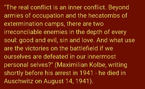 The words of Saint Maximilian Kolbe during the darkest moments of his own time speak eloquently to each one of us in the midst of the crises of the present day, and of those yet to come: