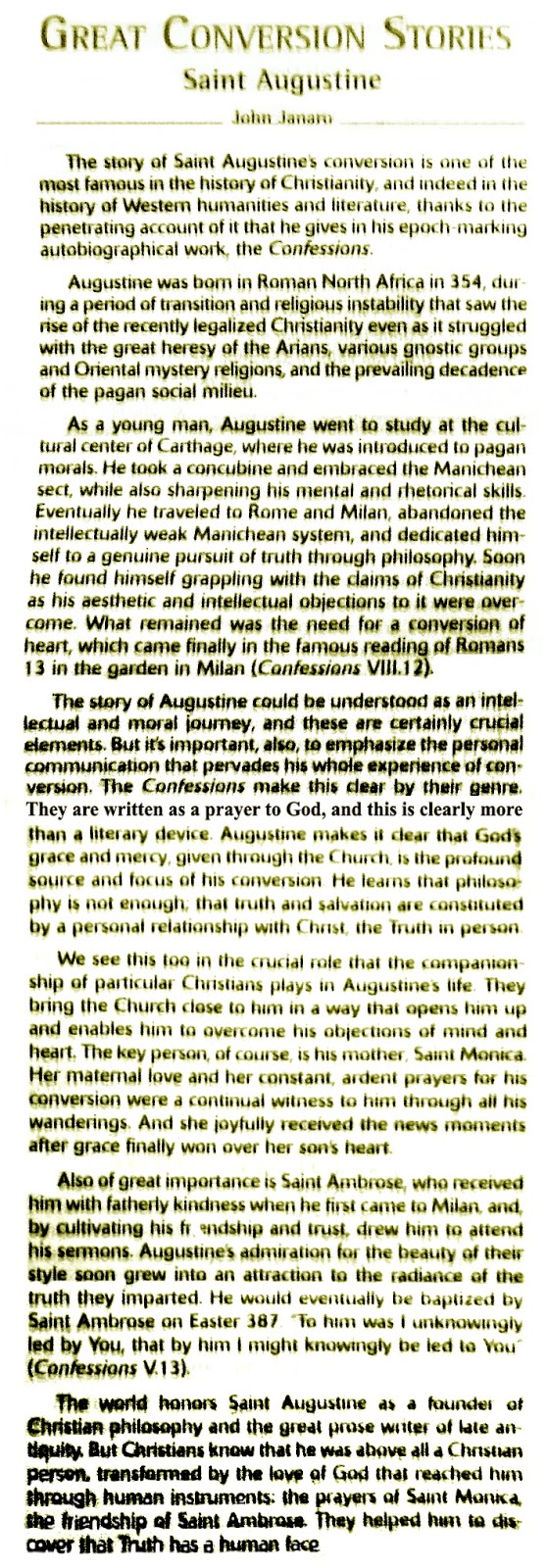 "Late have I loved you, O Beauty ever ancient, ever new, late have I loved you! You called, You shouted, and You broke through my deafness. You flashed, You shone, and You dispelled my blindness. You breathed Your fragrance on me; I drew in breath and now I pant for You. I have tasted You, now I hunger and thirst for more. You touched me, and I burned for Your peace" (Confessions, Book X).It may seem crude for a secondary source to try to recount the conversion of Saint Augustine, and yet people have been doing it anyway for well over a thousand years. Though they cannot replace or reproduce anything like the original, they have their own modest reasons for attempting to take the measure of some aspect(s) of this towering man.
