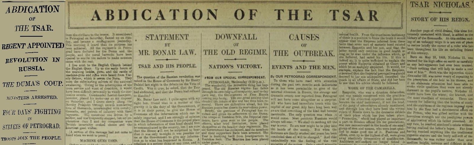 Thus it happened that the ominous transformation that occurred suddenly in Russia on March 15, 1917 (Gregorian Calendar) didn't reach English language newspapers until the evening of March 16 and the morning of March 17. Anglo-Americans were aware of the protests in St Petersburg in recent days, so it was not surprising that news was difficult to come by in this week.