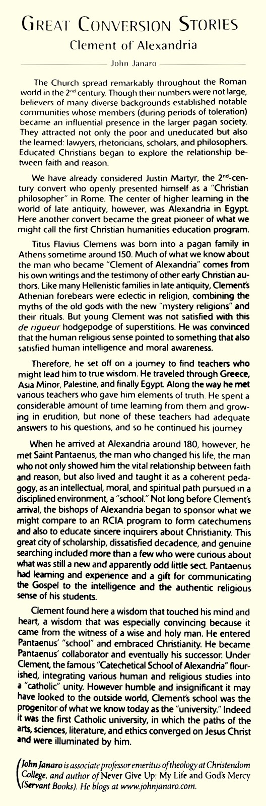 This month's witness comes from Clement of Alexandria, who in a certain sense was the forefather of the Catholic university as we know it today, with its confidence in both faith and reason.