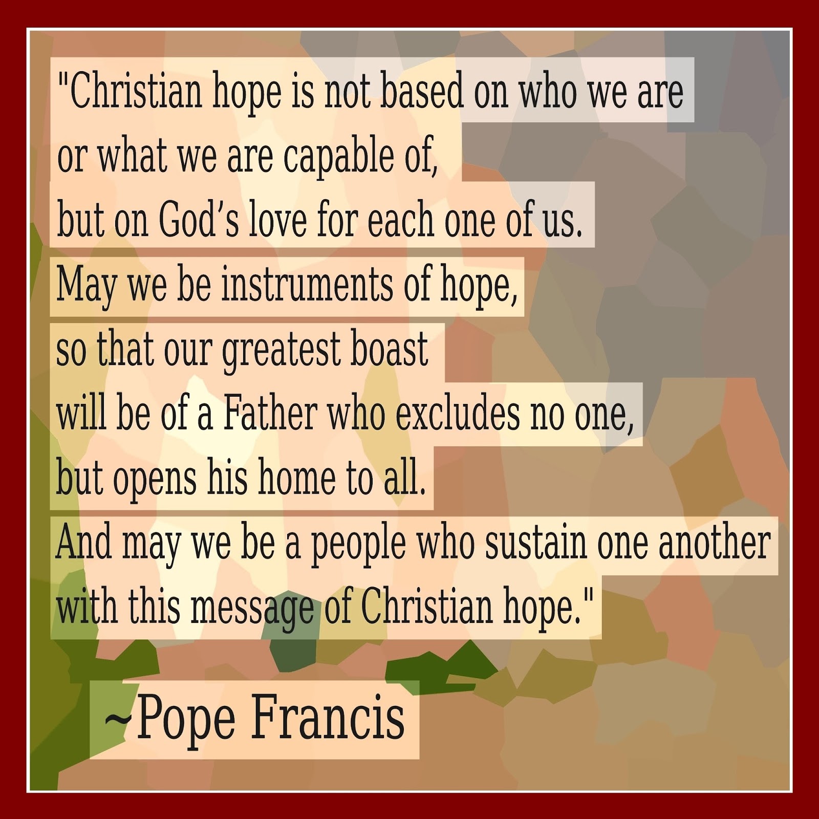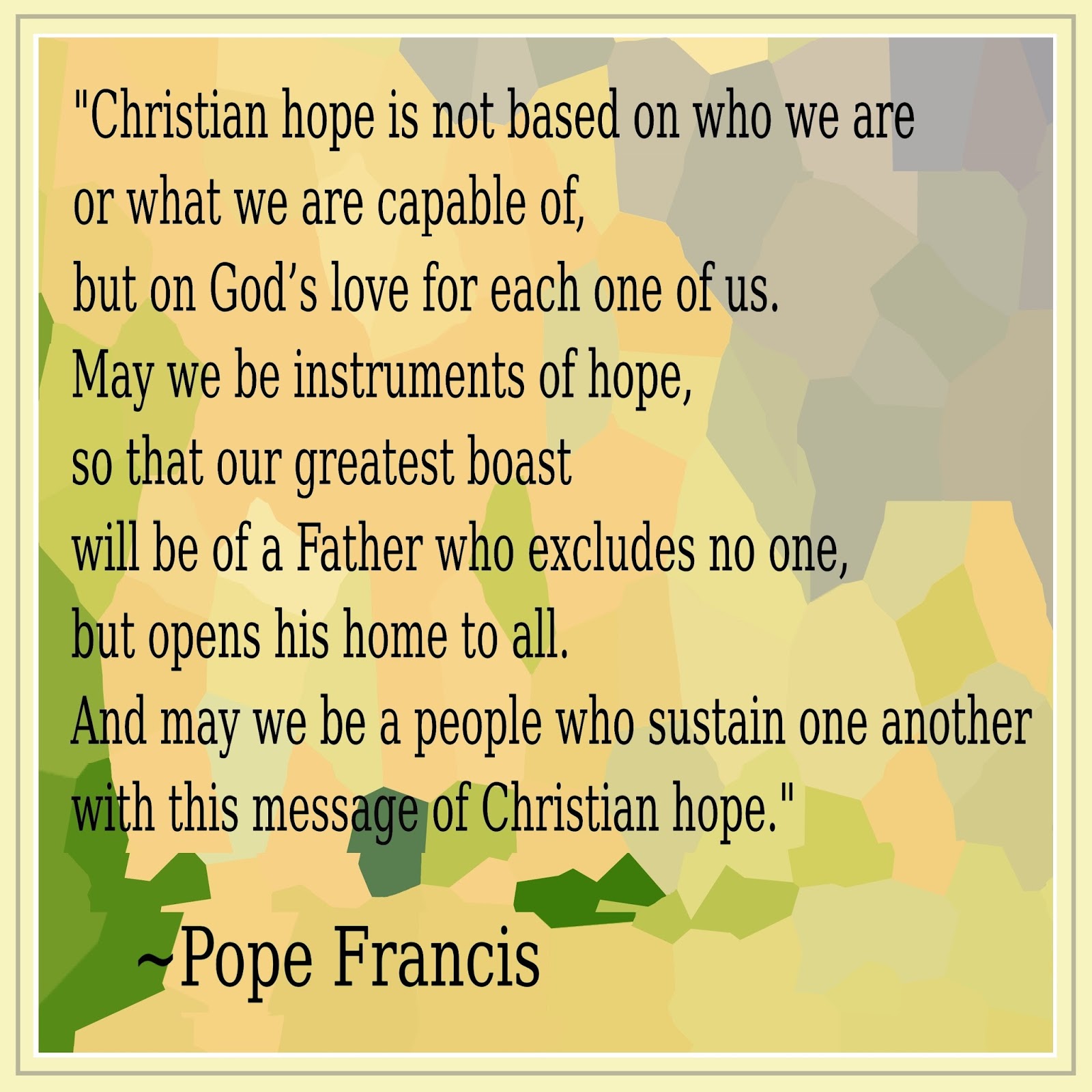 I have been messing around again with graphics, using texts from Pope Francis's most recent Wednesday Audience addresses in which he is presenting his catechesis on hope. Background, fonts, colors, patterns: using the resources lets some parts of my brain rest while others are engaged. And I can listen to music while I do this. Meanwhile there is the useful effort to learn the possibilities for presenting written texts in a visual context.