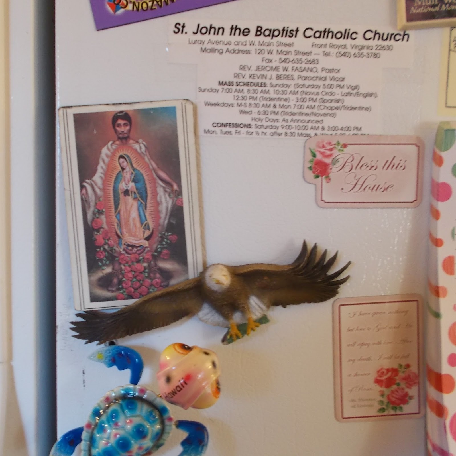 Juan Diego and the Madrecita are all over the house, but I decided to feature from our collection of home iconography this fridge magnet: