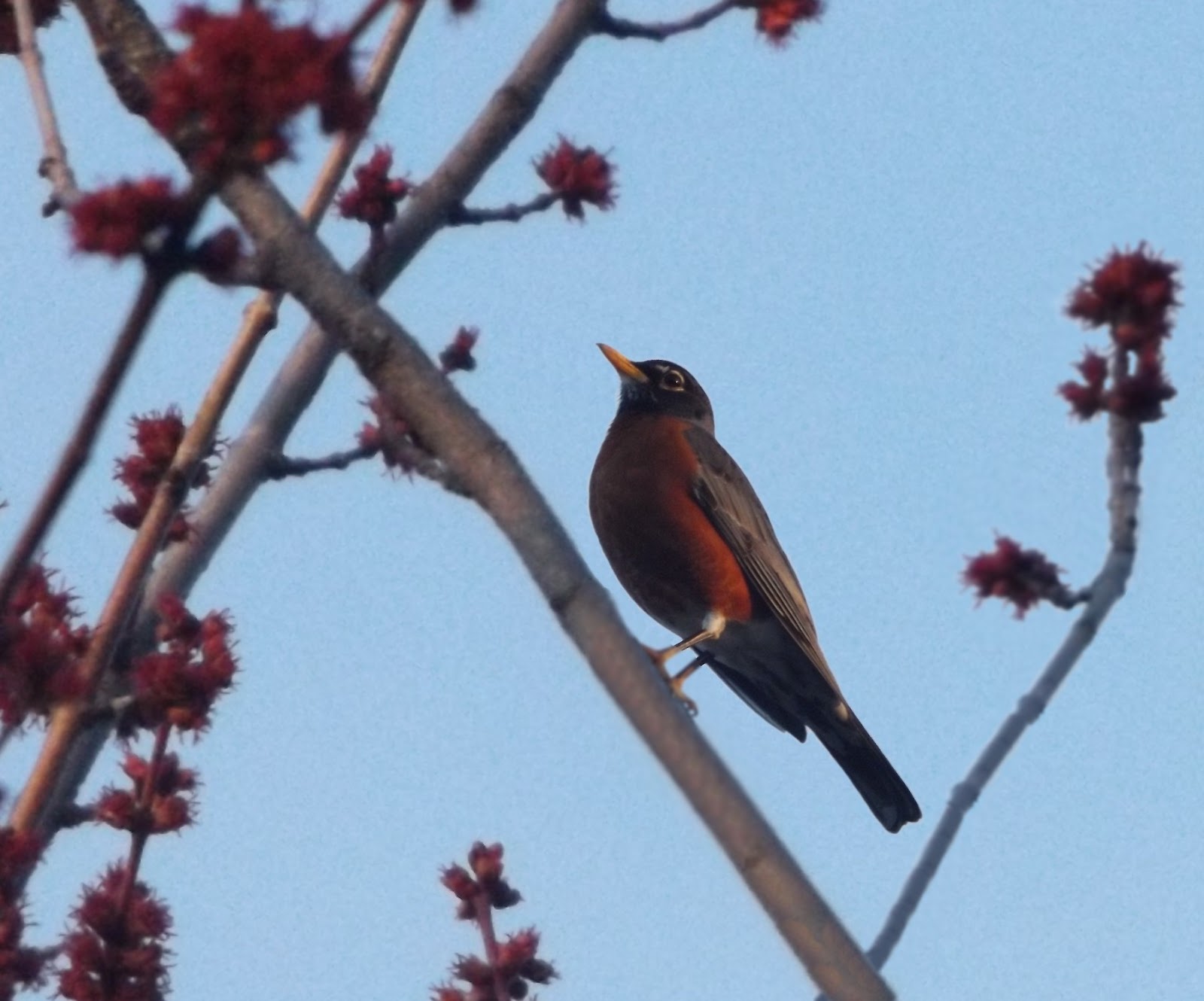 And the robins are all around, scouting for places to build nests when the trees are green.