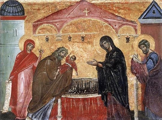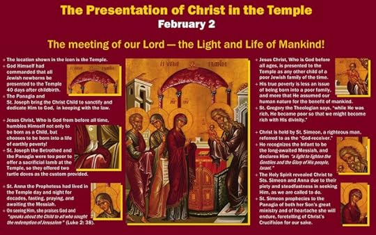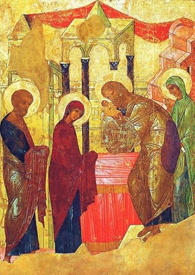 Here is the classic icon for the Presentation and a helpful explanatory overview. (N.B. Westerners, "The Panagia" is an ancient Greek reference to the Blessed Virgin Mary. Here we see it used as a proper name, "The All-Holy One.")