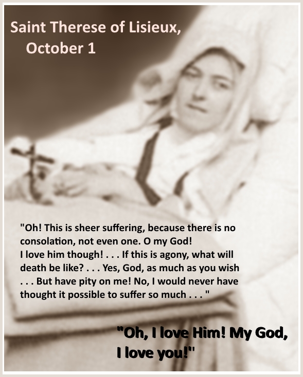 October begins with Saint Therese, who died of tuberculosis on September 30, 1897. She was only 24 years old. In her final days, several of her sisters recorded her words.