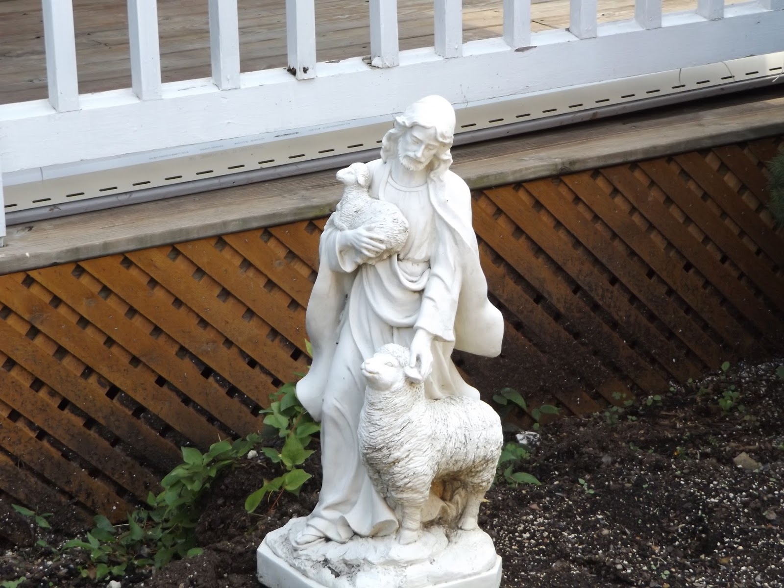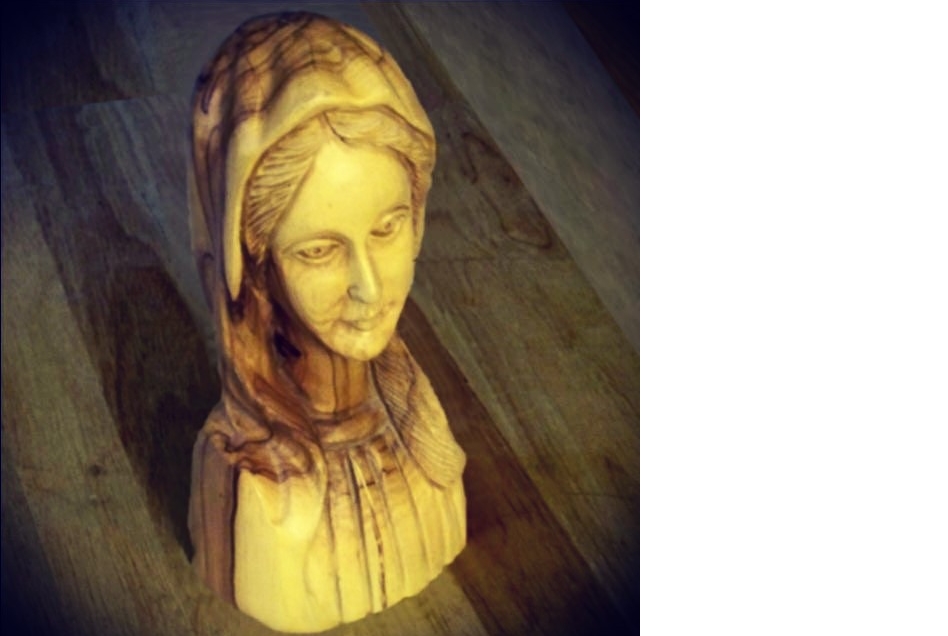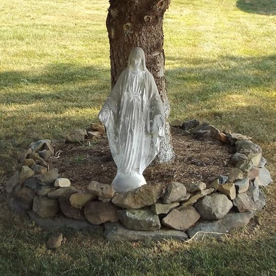 Under the shade of this pine tree, the shrine for well-weathered Mother Mary takes shape.