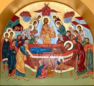 The icon of the Dormition often presents images of Mary's earthly life coming to an end, surrounded by the apostles. Above her is the image of the glorified Christ carrying Mary, who is represented as a baby wrapped in swaddling clothes (which are not unlike burial cloths). Just as Mary gave birth to the Incarnate Jesus in this world, so the Glorified Jesus brings about Mary's "birth" into eternal glory in a manner that is likewise fully incarnate, involving the glorification of her whole concrete humanity even "now," by anticipation, in this present age. The Theotokos is borne by her Son into the completion of Divine transfiguring life.