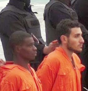 Two thousand years later, Christians are still getting their heads cut off for adhering to Jesus Christ. Look, Saint James even happens to have an orange robe in the stained glass window above, not unlike the orange jump suits of these Eygptian Christians from a few months ago. All James's killer needs is a mask, and he could pass for an ISIS executioner.