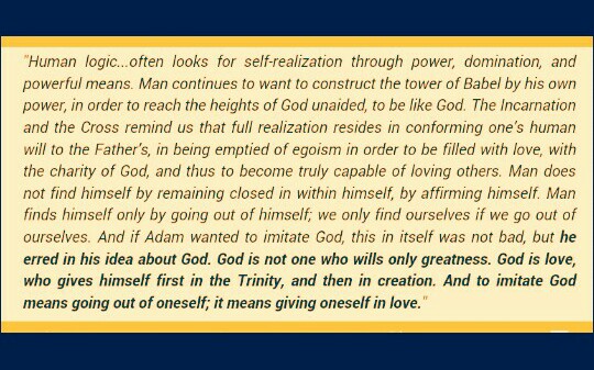 "God is not one who wills only greatness. God is love, who gives himself first in the Trinity, and then in creation. And to imitate God means going out of oneself; it means giving oneself in love" (Benedict XVI).