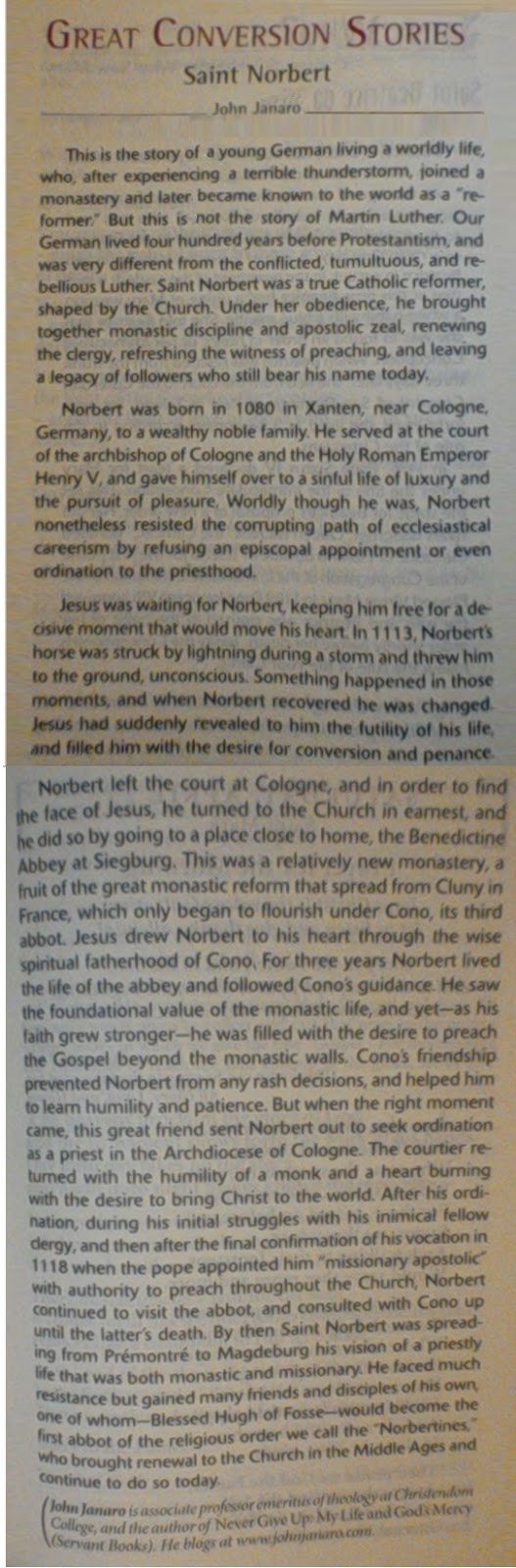 In case you missed the story of Saint Norbert's conversion and vocation (Magnificat, April 2015) or simply would like to read it again, I shall reproduce it here for your convenience. I encourage you, if you have not already done so, to subscribe to this wonderful magazine (click HERE).