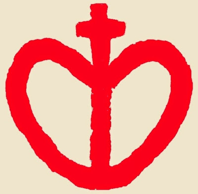 The image above depicts in iconic form the martyrdom of Blessed Oscar Romero, Archbishop of San Salvador, shot and killed while saying Mass on March 24, 1980. Here I have placed this Salvadorian artwork in a setting with a red background and an olive cross.