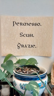 We are squeezed into a very small house and basically stuck with its mortgage. So we bump into each other a lot, squeeze past each other, and try to remember Pope Francis's "three words" (see picture): Permesso ("excuse me" or "may I?"), Scusi (sorry about that), and Grazie (thank you). We joke sometimes that an Italian heritage family also needs a forth word: Basta! (Enough! Stop! C'mon, quit making a fuss!).