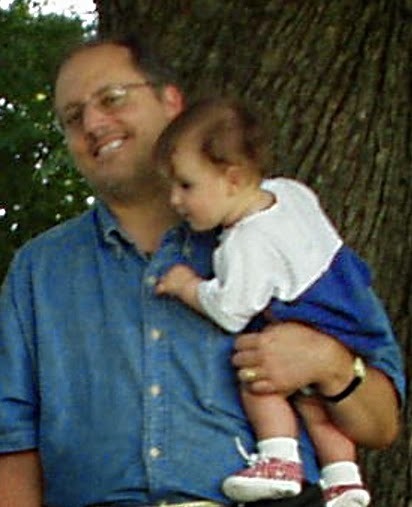 And here she is, curious as always, in the arms of her clean-shaven, forty year old father (ah, my lost youth...):