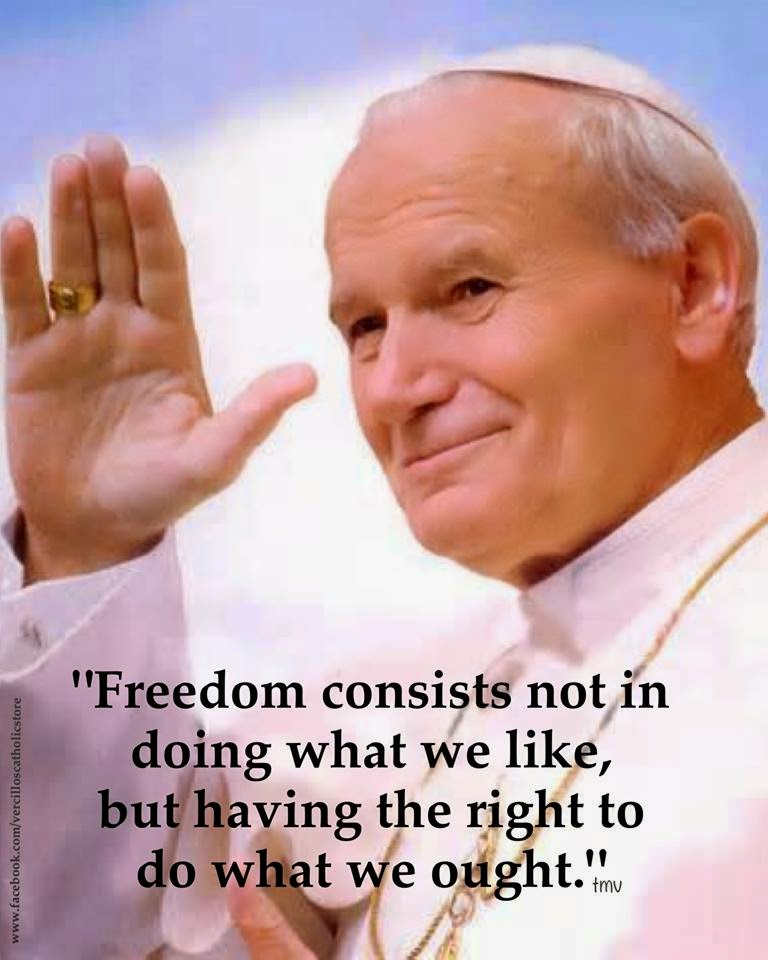 Karol Wojtyla (St. John Paul II) was a man who knew what it was like to be deprived of freedom. He knew what it was like to be prohibited by human powers from doing what free people ought to do, which is to try to know and love things as they really are, to search for the meaning of life, to help one another, to cherish the dignity of every human person, to walk toward one's destiny, to love one another. Freedom is for love. And this love does not rest, does not become fully free, until it gives itself to the Infinite One who alone is worthy of it, who draws it continually, beyond all things, toward the infinite life that has been promised to every human heart.