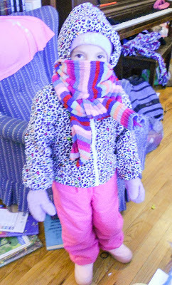 Yesterday was a sunny day and not too cold. Our front yard looked like a picture on a postcard (indeed, our lawn looks best when it's covered by snow, haha). When Josefina woke up, she could hardly wait to go play. She got herself prepared with lots of warm clothing: