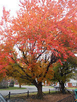 For contrast, I decided to take another picture this afternoon, as the sun was already quite low. We often have unusual angles of light this time of year. Once the trees become bare, new vistas open up. Winter is not so depressing, really. In fact it lets us see many things we can't see when the trees are full. Right now there are still some leaves, and some color, on the trees: