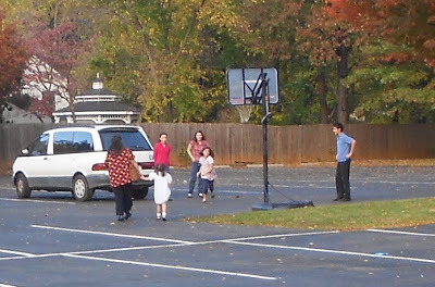 Here's a rare one that I took a couple of weeks ago: I aimed the camera at a parking lot and, zoom, voila, everybody! (Except me, of course.) It has become pretty rare to get Mommy and all the kids all together in a picture in an unplanned, unguarded moment. Unfortunately, its not very clear, and I only got Eileen's back (Jojo too, but we see plenty of her in pictures). Still, it gives a sense of how the family occupies space in the Fall of 2013. (And, yes, the big guy is John Paul. There they are admidst the colors. I love these people so much!)