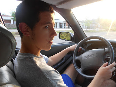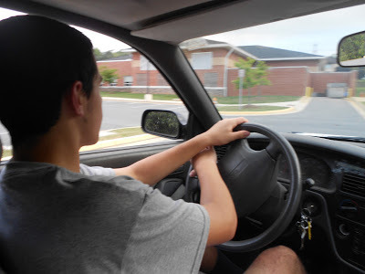 parking lot of the public library on a Sunday. So far we're just doing parking lots).Yes, its really true. He is driving the car. Eileen and I have both taken him out onto the asphalt (though not yet into traffic). He is learning quickly, and in no time at all I am sure he will be a better driver than I am. We just went out to practice behind the K-Mart and Martins. These long back lots simulate a stretch of road. We drove around for quite a while, and then we parked and went into the K-Mart and bought a new basketball.