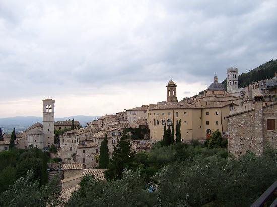 We had all of our baggage with us, so we stayed in a small hotel right across the street from the train station, at the foot of the hill where the old medieval town rises up to the sky. The window of our room had a perfect view of Assisi.