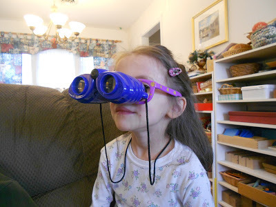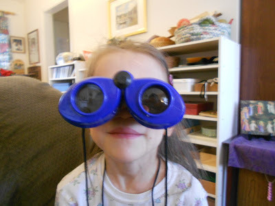 Josefina has strapped on these binoculars on so she can have super vision (and look silly)