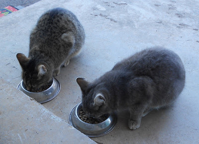 Alexandra and her daughter Reepicheep, our two OUTDOOR cats, eating fancy-pantsy