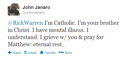 I know very little about Rick Warren's work as an evangelical minister or his famous books. It doesn't matter. He's a human being, and a father. His wife Kay is a human being, and a mother. Along with thousands of other people, I sent them each a tweet expressing sympathy and solidarity. It won't reach them personally, but that doesn't matter. Solidarity is in the heart, and the human heart is the original "social network" and remains the only one that's necessary; the one that gives value to all communication. Twitter has some value, if it can be used to express a work of mercy.