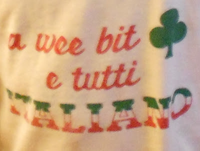 "A wee bit Irish (note the shamrock) e tutti Italiano!" A wee bit Irish and all Italian? Is it possible to be "a wee bit" Irish? I don't know.