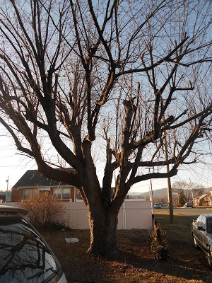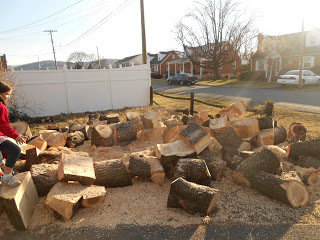 You gotta be kidding. What really happened is that the wonderful town of Front Royal did us a favor. Because they are so nice and they really care. And also because they didn't want those tree branches to fall on the power lines and cables that run in front of our house. The friendly tree trimming people came by and offered to cut the whole thing down. For free. And let us keep the wood (which we're giving away to our wood burning friends--more than half of it is gone already). For free.