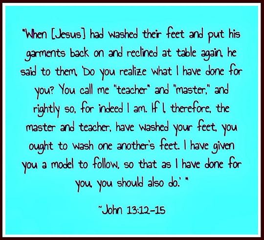 "When [Jesus] had washed their feet and put his garments back on and reclined at table again, he said to them, 'Do you realize what I have done for you? You call me "teacher" and "master," and rightly so, for indeed I am. If I, therefore, the master and teacher, have washed your feet, you ought to wash one another’s feet. I have given you a model to follow, so that as I have done for you, you should also do.' "