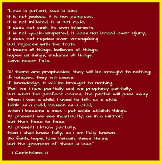 Enduring all things. That certainly seems beyond any sort of limited human love. But also patient, kind, not pompous, not rude, not quick-tempered or self-interested. It rejoices in the truth. It never fails.