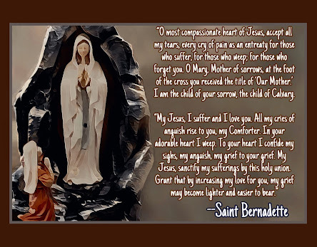 In this text she prays: “O most compassionate heart of Jesus, accept all my tears, every cry of pain as an entreaty for those who suffer, for those who weep; for those who forget you. O Mary, Mother of sorrows, at the foot of the cross you received the title of ‘Our Mother.’ I am the child of your sorrow, the child of Calvary. My Jesus, I suffer and I love you. All my cries of anguish rise to you, my Comforter. In your adorable heart I weep. To your heart I confide my sighs, my anguish, my grief to your grief. My Jesus, sanctify my sufferings by this holy union. Grant that by increasing my love for you, my grief may become lighter and easier to bear” (Saint Bernadette).