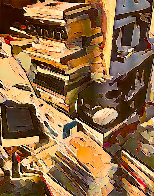 Maybe my stuff is not what one would call “riches” in the ordinary sense of the term. A lot of it is broken, useless, or outdated junk. Then there are books, in great stacks on shelves, on desks, on tables, on the ground (such as the piles represented in this artistic-ish illustration). And then there are… more books.