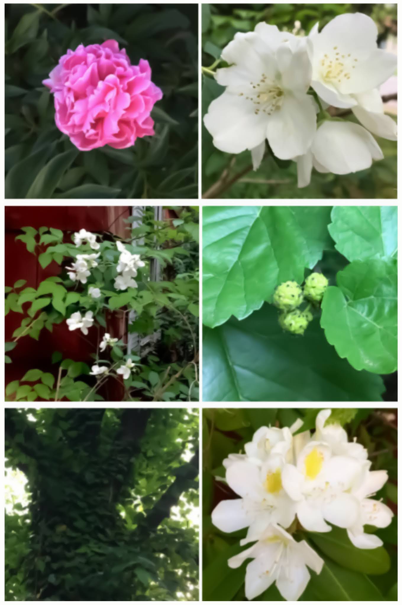 Below, from left to right, we have (1) reddish tinted peony; (2) and (3) “mock orange” blossoms - which means that we won’t get any oranges here; (4) “witch-hazel” buds, which will flower later in the year; (5) out-of-control vines on a lush green maple tree; (6) white rhododendron flowers, which bloom later than the more exotic-looking purple ones.🌳💐