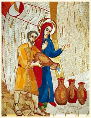 As our Mother, she collaborates in a singular way with her Son Jesus Christ, the Word made flesh - a way, of course, that is entirely subordinated to His redeeming and transforming grace. Mary's universal motherhood is indeed a special gift of Christ's grace as He redeems us through His Incarnation and Paschal Mystery (which we have celebrated in these months), and as He continues to work in the Spirit to bring us to our fulfillment in the Kingdom of the Father, the New Creation. Mary's maternal tenderness extends to each of us and to the whole Church. Just as we find her gathered with the Apostles and all the other disciples in the upper room when the Holy Spirit is poured out at Pentecost, so we find her on every moment of our journey toward the fulfillment of our vocation. Mary's motherhood is supernatural yet also most profoundly human in the way it makes us brothers and sisters of her Son Jesus. She remains with us in her maternal tenderness and solicitude, and her advocacy of our total need for God's love, our total dependence, to which He responds with a miraculous superabundance (as we see at the wedding feast at Cana - cf John 2:1-12).