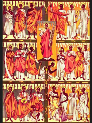 The Uganda Martyrs are commemorated today, the anniversary of the burning-to-death of Saint Charles Lwanga and his fellow royal pages on June 3, 1886. There are also other martyrs during this period who are grouped into today's feast. Each one has an awesome story that was carefully recorded from eyewitness testimony for the Beatification proceedings in the 1920s.