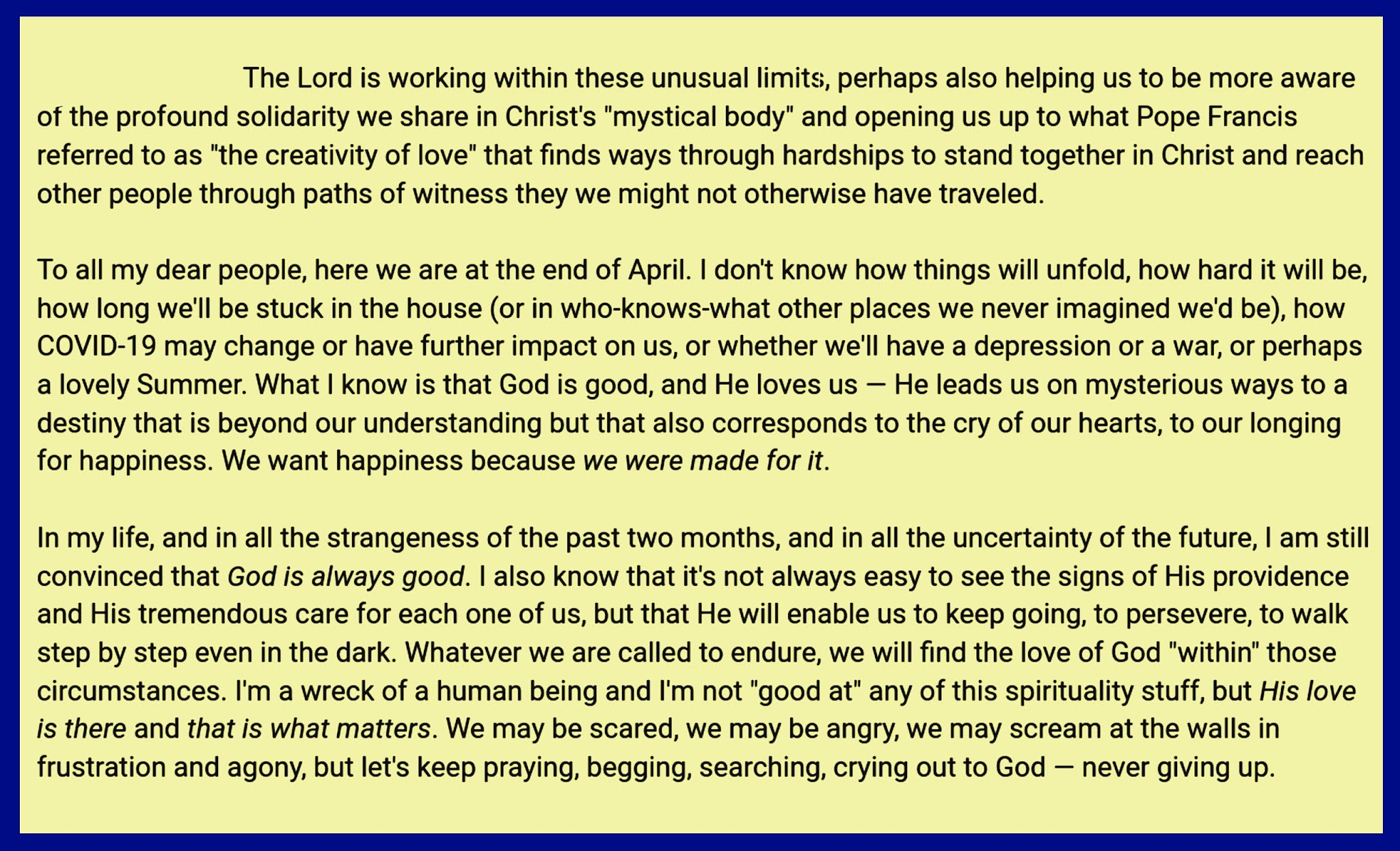 Let us therefore be grateful to hear about and see pics of new things. We have opportunities here to stay in touch in a rich way. Even as God calls us to new things, old friendships will grow as we seek to grow in Him. This is a mystery, and it does not need social media to happen, but these are tools we can use to help us remember that the "Mystical Body" is not an abstraction.