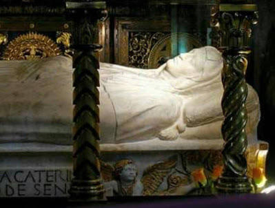 This image is from her tomb in the church of Santa Maria Sopra Minerva in Rome. To go there felt like visiting a wise and kind friend nearly three decades ago when I was living in Rome. What fire she must have been during her life, drawing so many to a deeper relationship with Christ and counseling (even admonishing, with firmness but also winning affection) popes and princes and the great people of her time. Her time, of course, was the latter part of the 14th century: a time of restlessness and great change, a time full of problems and dangers for the Church and society in Europe. There was much need for admonishment in those days, along with courage, wisdom, clarity, single-heartedness, and witness to the reality of the presence of Jesus amidst a multitude of distractions, lies, and violence. In their basic needs and in their brokenness, those days were not unlike our own.