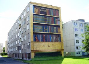 Below: In 2014, designer József Páhy devised this bookish façade for a housing estate in Kazincbarcika, Northern Hungary. That’s a teddy bear on the bottom shelf.