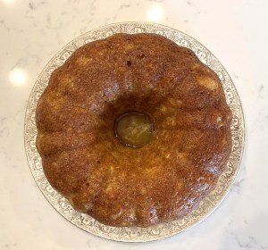 When cake is done, remove pan from oven. Set on rack for 15-20 minutes and then invert cake onto plate. Pour glaze over top and sides of warm cake. Cool until ready to serve and then cut into slices. Serves 16-20.
