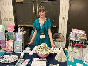 I’d signed up to share a six-foot table and that was adequate. It didn’t appear that displaying books on racks made any difference to sales. I had fun seeing what other authors offered for swag. The usual magnets, key chains, candy, pens, stickers and other goodies prevailed. I liked the glow headsets one author provided. QR codes were popular among this crowd. These could send readers to Bookfunnel for a free book, or to a retail site or a newsletter signup. The codes were engraved on a fan, put on a sticker at the back of a lollipop, or came on a business card.