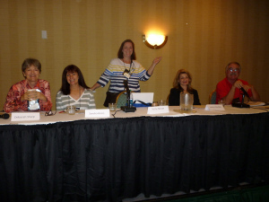 The panelists first spoke about tips for getting noticed. Sandra advises authors to determine your audience and go there. For example, her series is set a coffee shop. So she's presented at coffee conferences, written an article in trade magazines, and done events at coffee houses.