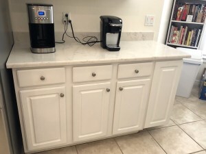 In the kitchen, we replaced the old Formica countertops with quartz stone. We added two lower cabinets. One has a drawer and pull-out garbage cans. The other has a wine rack with shelves.