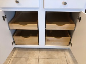 Regarding the cabinets, we kept the white ones that were here when we moved in as they were in good condition. We did add pull-out shelves to the lower ones.