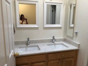 In the laundry room, we replaced the old countertop and sink. It made an amazing difference. The upstairs bathroom also looked dated with Formica countertops and a wall-wide mirror. We replaced the countertop along with new double sinks and installed matching mirrors from the At Home store in Lake Mary. We kept the cabinets as is because they were in good condition. Laundry room is on the left; bathroom is on the right.