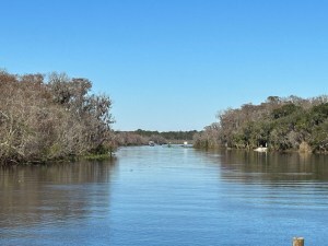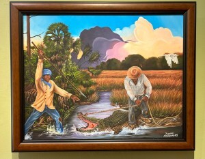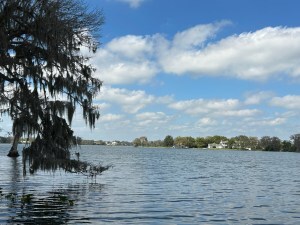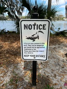 I could see the appeal for young adults but not seniors like us who prefer more atmosphere for a lunch venue. We came on a quiet weekday but I understand they can get lines of cars waiting to get in on weekends. Artists had set up their easels along the waterfront on the day we visited. A sign warned of gators and snakes so swim at your own risk if at all and don’t fall out of your boat.
