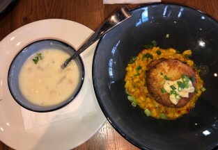 Our day at Disney Springs was better. We met our kids for an anniversary lunch at Paddlefish which was very enjoyable. Here’s my clam chowder and crab cake meal.