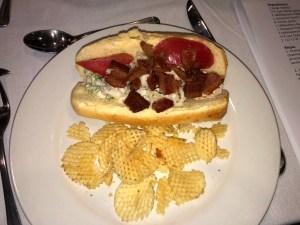Lobster Rolls with Heirloom Tomatoes, Bacon and Tarragon Aioli – This dish was interesting to taste but a salad would have been a better course here. I could see substituting baby shrimp to make this at home. I’d also serve it for lunch rather than dinner. This came with a B&G Bordeaux Sauvignon Blanc wine that had a slightly fruity aroma.