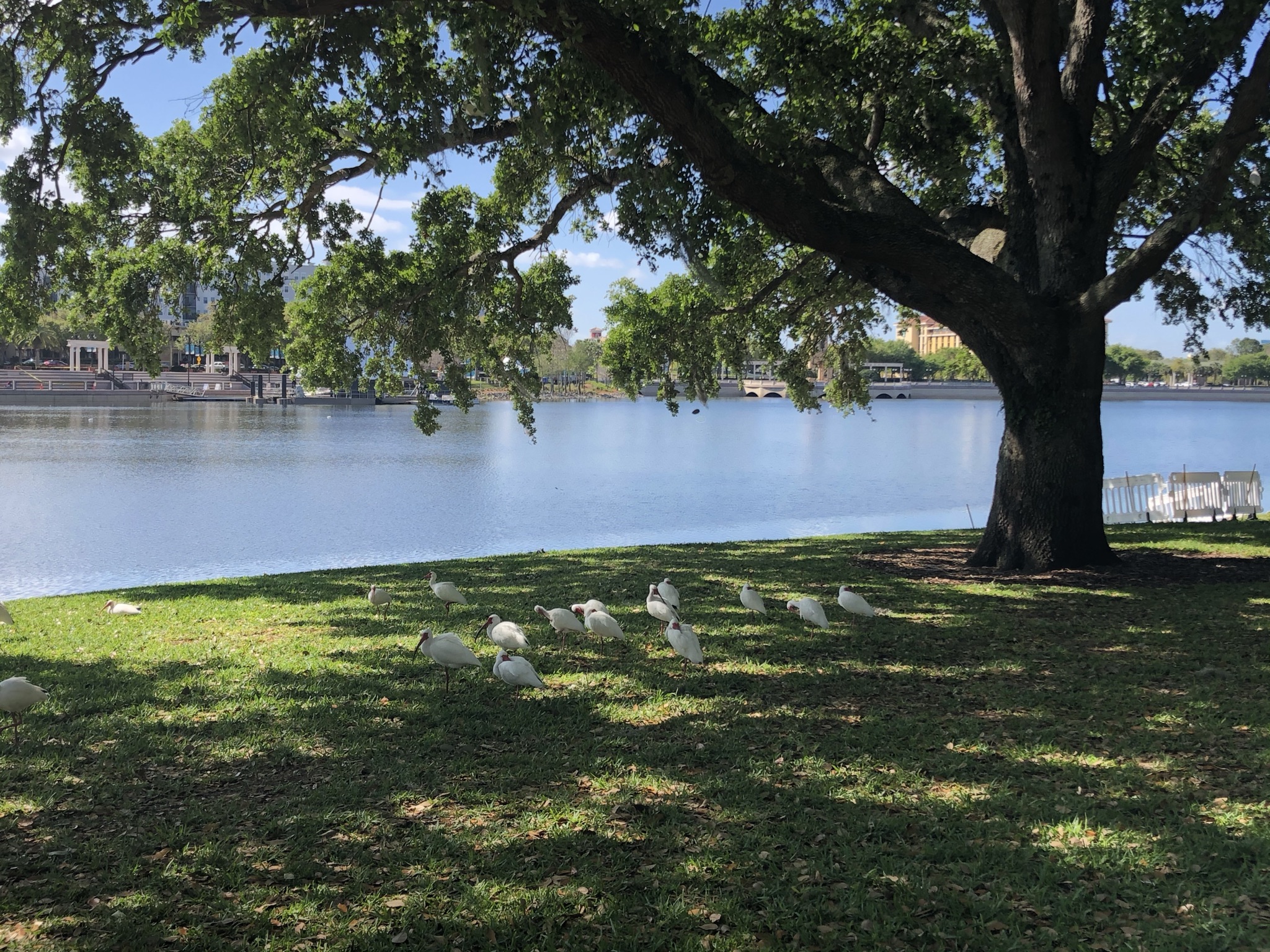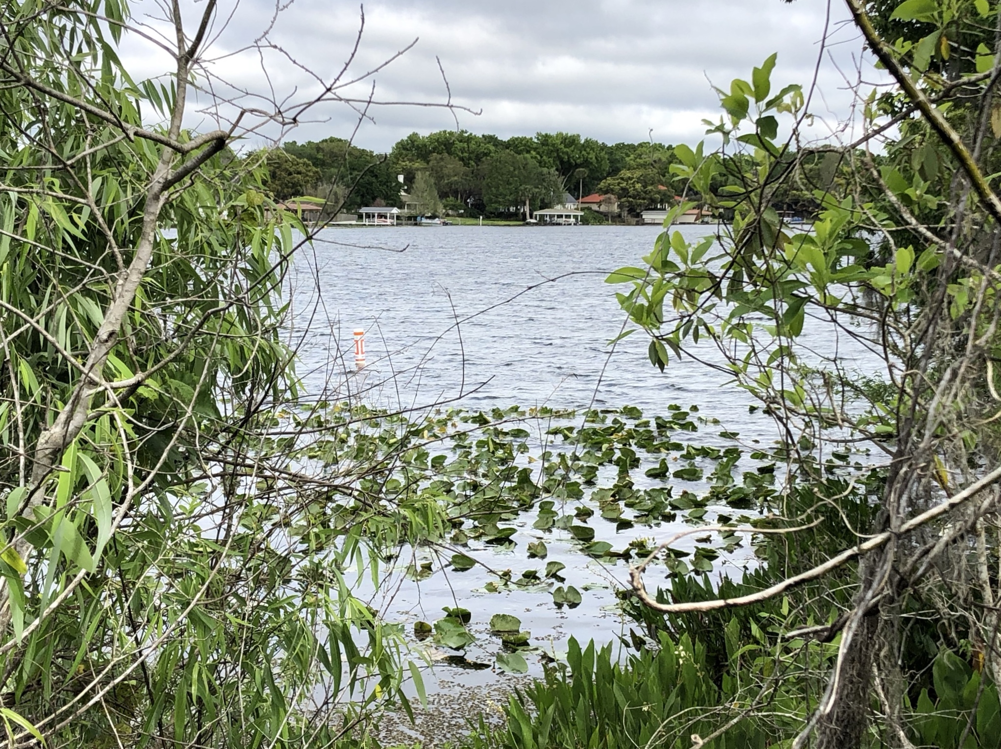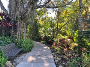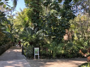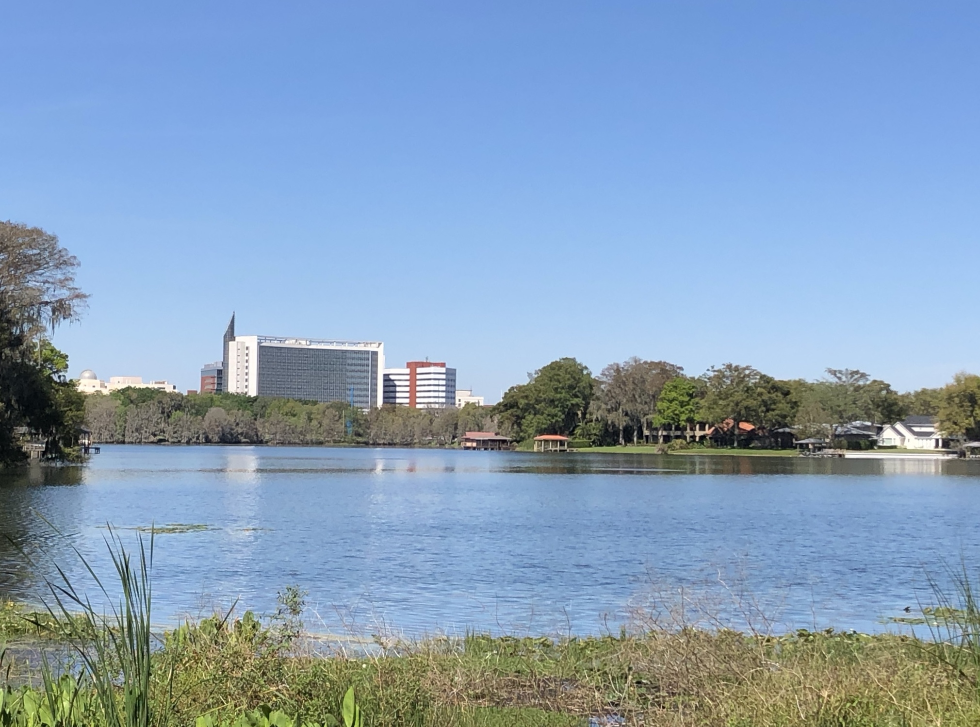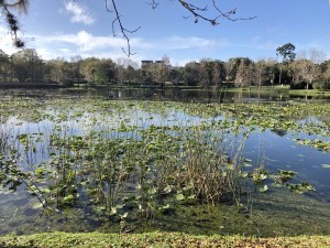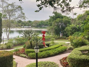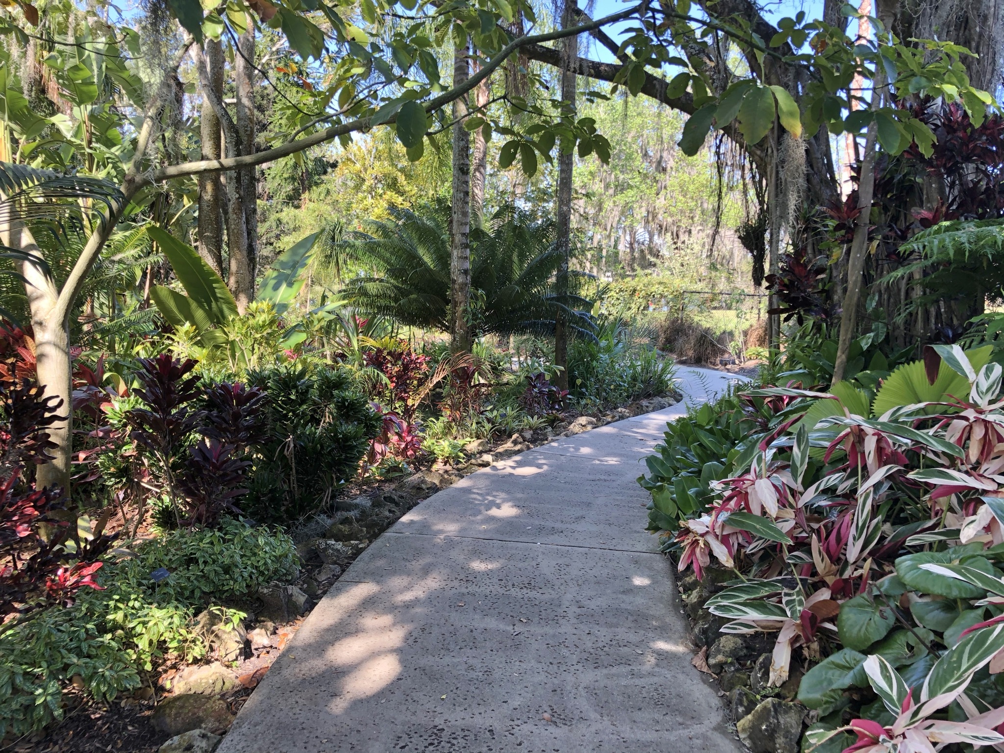 My favorite section is the Tropical Stream Garden with shady paths and tropical plants like in a rainforest. The sounds of a trickling brook follow you as you continue along toward Lake Rowena for scenic water views. Across the way in the photo below and on the left is the Orlando Science Center, a trip for another day.